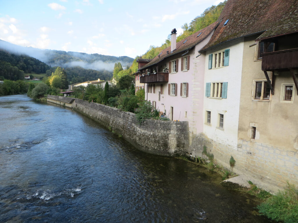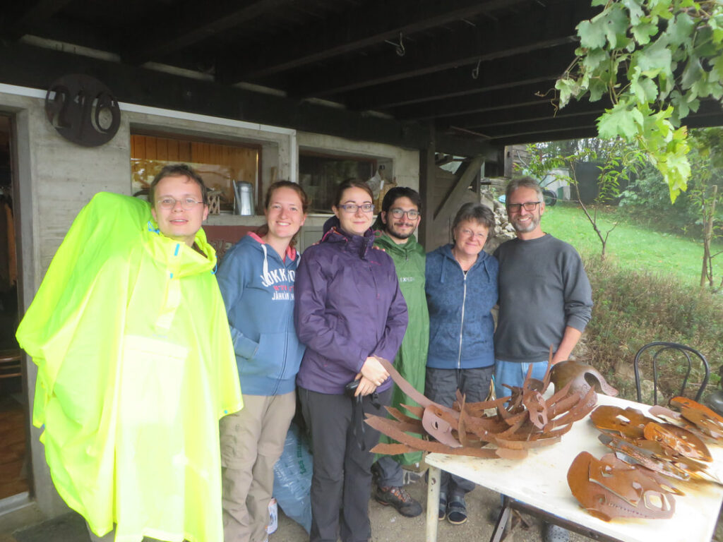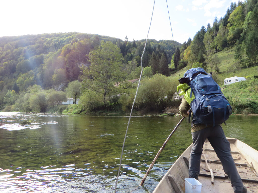 Après notre premier concert à Beurnevésin, nous nous mettons en route pour Saint-Ursanne. Après quelque 25 km, un bon café et un morceau de tarte nous attendent sur une terrasse au bord du Doubs. Le lendemain, nous le remontons jusqu’au moulin de Soubey. Joli moment : la traversée du Doubs en barque ! Notre chemin se poursuit jusqu’aux Prailats où nous découvrons l’atelier de facture de serpents de Stefan Berger.